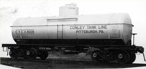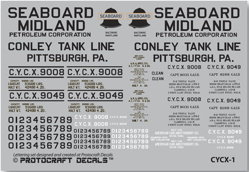 The Conley Tank Car Company was mostly an owner of repaired tank cars which it repaired in the Conley plant in Franklin, PA in the 1930s. Reporting marks were CYCX. Conley in turn leased it’s repaired tank cars to various petroleum companies, or in the case of Seaboard Midland, in Midland, Texas, leased new tankcars built by AC&F. CYCX was part of a large eet of uninsulated 8000 gallon tank cars in Series 5001-10000 built for general oil or liquid service.