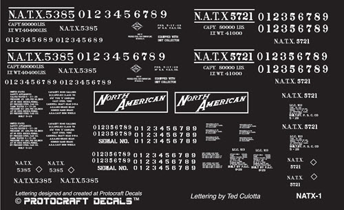 ![]() North American Tank Car Line 8,000 gallon tank car by Pressed Steel Car Company. Car painted black with white lettering. Lettering by Ted Culotta. ![]() ![]() Background color shown above is not included in decal sheet |
