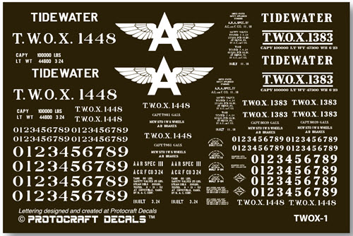 Tidewater Oil has been around for over 80 years and includes it’s line of lubricants under the Veedol and Tydol brands on it’s tank cars as well. Ownership was accuired by Standard Oil of New Jersey in 1930 and later went to Getty Oil, all who kept the Flying A brand up through the 1950’s. The number of tank cars bearing the Flying A, Veedol and Tydol markings is not known and so we are limited by photographs of these cars. The two sets of lettering styles are included in this sheet so that the modeler can choose which car to model. Car is all black with white lettering. Decal sheet designed at Protocraft Decals.