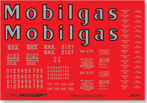 ![]() Mobil Oil had many entities within it’s umbrella of companies of which Socony Vacuum is one. Mobil had numerous AC&F Type 11 and 17 tank cars in it’s tank car fleet, of which SVX 2127 is but one example. Mobil’s tank cars were painted bright red (CMYK red) with silver lettering, black frame and truck side frames; wheels unpainted and left to gather road grime and rust. This sheet is designed to accomodate many different road numbers enabling the modeler to select the prototype car to be lettered. This decal sheet is designed and sized at Protocraft Decal Line with lettering and artwork by Ted Culotta and licensed by Speedwitch Media.