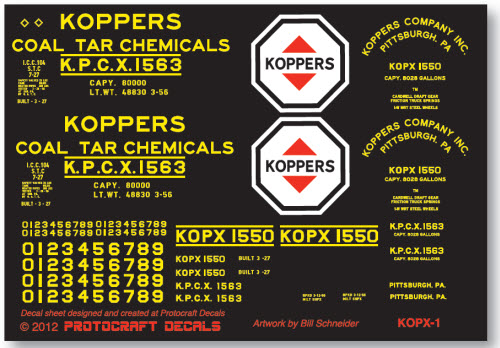 ![]() The KPCX 1550-1583 series were purchased second-hand in the mid-1930s, and there's no way to know who Koppers acquired them from or whether they were insulated when purchased or the insulation was added by Koppers. At any rate, there were 34 of them, all 8,000 gal. TMI class insulated cars originally built in 1917 by the Standard Tank Car Co. of Sharon, PA and the series continued unchanged through the late '30s, World War II, and on into the 1950s. By 1955, one car (1564) had the insulation and outer sheathing removed but the other 33 cars were still shown as insulated cars of class TMI. Their number was somewhat diminished by 1958, when only 30 cars (including 1564) remained in service, and all were gone by 1962. Like other Koppers insulated tank cars, they were used to ship coal tar chemicals. Richard Hendrickson This decal set was designed and sized at Protocraft Decals with lettering and artwork by Bill Schneider ![]() ![]() Background color shown above is not included in decal sheet |