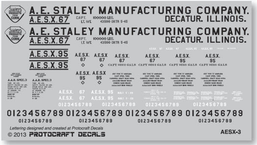 ![]() Pressed Steel Car Company built a large number of 8,000 gallon tank cars during the 1920's, primarily for North American's tank leasing operations. In the late 1940's, when A.E. Staley turned over their tank operations to North American, many of the cars were repainted and lettered in AESX reporting marks with white, orange or silver paint schemes. AESX 67 and 95 are an examples of tanks painted silver with black lettering; bottom sheet, underframe, hand rails, grab irons, ladders and trucks coated with black car cement. This lettering set was created and designed at Protocraft Decals. ![]() ![]() Background color shown above is not included in decal sheet |