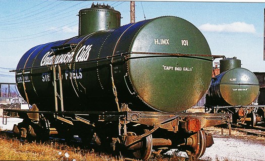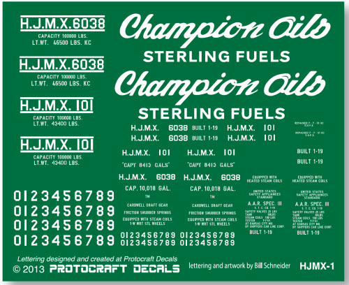 Sterling Fuels Company of London, Ontario, Canada, acquired a number of 8,000 gallon tank cars used from various sources.  Reporting marks HJMX stood for owner H.J.McManus.  Series numbers included 101-103.  The 6019-6028 Series were acquired in 1954 and built in 1916.  Additional cars included Series 6038 above.  Tanks were painted all medium green including the bottom sheet, with all white lettering.    This lettering set was created and designed at Protocraft Decals with artwork by Bill Schneider.