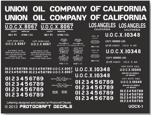 ![]() The Union Oil Company owned a fleet of over 6,000 tank cars. Their numbering system reflected the tank's capacity; hence a 6,000 gallon tank car were numbered in the 6000 Series; 8,000 gallon tank cars in the 8000 Series, 10,000 gallon cars to the 10,000 Series. UOCX 8067 was measured at 8188 gallon water test when built at the American Car & Foundry plant in 1924. Union Oil owned many uninsulated tank cars as seen in the 1949 photo of UOCX 10348 below, built by General American Transportation Corp. Cars were all black with white lettering. Note the name off center to the far left end of the car, an earlier layout of the company in 1924. UOCX 10348 has the 1949 layout without the horizontal 1 inch stripes in the reporting marks and a lighter number font. Decal set designed and created at Protocraft Decals. ![]() ![]() Background color shown above is not included in decal sheet |