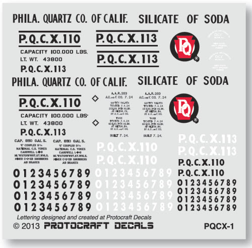 ![]() Philadelphia Quartz had two divisions, one in Philadelphia (PQX) and the other in Berkeley, California (PQCX). The Berkeley division had only a few cars: PQCX 108-110 built under AC&F Lot 1603 in January 1937, and PQCX 111-112, under Lot 2265 in May 1941. PQCX 113 below was purchased used and was built by Standard Tank Car in 1918. The tank was pressure tested on April 2, 1952. Paint & Lettering: Tank, including bottom sheet, painted aluminum, frame black. Lettering all black on aluminum and white on black. Note: there are photos of PQCX 108 and 110, painted with a black tank, an aluminum band and dome with aluminum lettering. See decal sheet PQCX-2 Lettering set designed and created at Protocraft Decals ![]() ![]() Background color shown above is not included in decal sheet |
