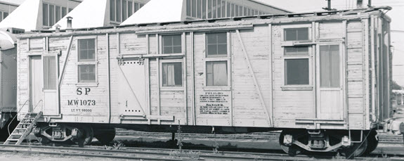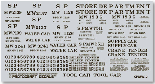 This decal set covers wood boxcars converted to crew sleeping quarters - usually B-50-4, 5 and 6’s, and stores boxcars, water cars and maintenance cars. The modeler can pretty much follow these photographs (or other photographs) to create an accurate work car or a number of different ones to make up a typical SP work train by cutting in windows and doors, side ladders and smoke jacks.