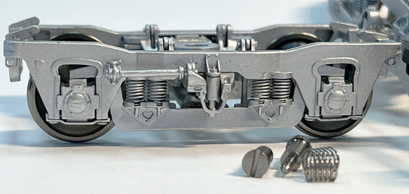 Budd Company’s 41-ND disk brake passenger truck in Proto:48.  8’-6” w.b., single-pointed 36” steel wheels, tapered stainless steel axles mounted on ball bearings, fully equalized, removable keepers, all-brass, in black or silver - a very accurate model built in Korea by Boo Rim Precision Engineering, using Edw G. Budd Co. factory/builder plans dated April 1946.  Please type or write in your choice of color with your mail-in  order.