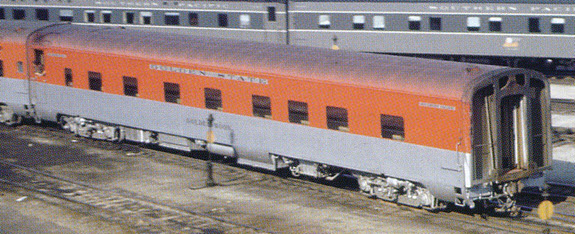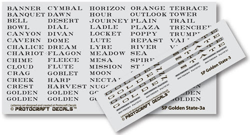 The Golden State Limited was conceived in 1946 as Train #3 and #4, in order to compete with the Santa Fe’s Chief and UP’s posh all-Pullman City of Los Angeles. The train could never make the competion’s schedule and as a result enjoyed a short lived existance and an ignoble demise by late1951. But starting in May 1947, the train was painted a distinctive red and silver post-war color scheme and more new cars were added from Pullman. A sister train, the Golden Rocket, was built and lettered by Pullman but discontinued before it ever ran as a train. Golden Rocket cars came with uted sides and lettered with the Rock Island’s distinctive square gothic lettering design, whereas the Golden State cars of the SP were all smoothside cars and came with SP’s Roman style lettering. The RI cars were interspersed in the Golden State consist, still lettered Golden Rocket (see Protocraft Decals sheet Golden Rocket-1). The CRI&P and SP never really were in sinc about the train and the interiors and maintenance were distinctly dierent, and eventually there was a falling out. By 1953 the SP’s cars were repainted and, still as Train 3 and 4, an all SP train, ran as part of the Golden Sunset. (see Protocraft decal set Golden State-2)