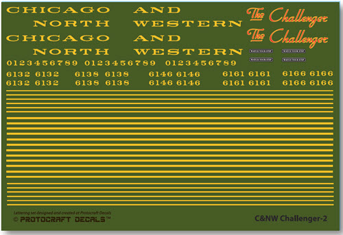 ![]() The Challenger service, with it’s low priced seats, 95 cent dinners, and economical travel, became one of the most successful trains in the history of train travel. Initiated in May 1936 as an all heavy-weight train, it continued until 1957, primarily by the SP and UP. The C&NW, not to be left out, in July 1937, ordered and received light-weight passenger cars with 15, 48-seat chair cars - numbered 6132-6147, and 7, 56-seat chair cars with a nurses room - numbered 6160-6166. These operated as part of the Challenger consist between Chicago and Los Angeles with the UP, and between Omaha and San Francisco with the SP. Challenger service terminated in late 1947 with all three railroads, but was later reinstated in 1952 with all new consists in UP color scheme. In October 1955 the C&NW dropped from the Challenger service in a dispute over fare sharing. (to be replaced by the Milwaukee Road) Paint & Lettering: Cars were painted with Pullman Green (DuPont 88-5502), imitation gold (DuLux yellow DuPont 95-020) lettering with 4 imitation gold stripes on the side, the red Challenger script and a black (Dednox FL #32) roof. Trucks and under-frame black. Decal set designed and created at Protocraft Decals ![]() ![]() Background color shown above is not included in decal sheet |