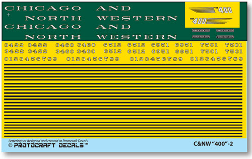![]() The Chicago & Northwestern’s famous train, “The 400”, was inaugurated in 1935 for fast service between Chicago and St. Paul/Minneapolis. The train took its name from the schedule of 400 miles in 400 minutes, sometimes reaching a speed of 95 to 100 mph. This was a heavyweight train pulled by the road’s Class E-2 4-6-2 Pacic type locomotives. In 1939, a pair of EMD E-3A locomotives and 20 new lightweight streamlined passenger cars were inaugurated. The A-A combination never had to be turned. Each train consisted of a baggage-taproomlounge, four 56 seat coaches, one 56 seat diner, three 27 seat parlors and one round end parlor-buet-lounge observation. The train was Y’ed at the Chicago steamliner ramp and pulled backward from St.Paul to Minneapolis. In 1941, these were replaced by E-6’s and in 1947, E-7’s. The name 400 attracted a lot of business and by 1941 a number of other C&NW passenger trains included 400 in their names: Flambeau 400 with service between Chicago and Green Bay; the Minnesota 400; the Valley 400 and the Shoreland 400. Decal set designed and created at Protocraft Decals Paint & Lettering: Cars were painted yellow and green w/trucks and underframe black. ![]() ![]() Background color shown above is not included in decal sheet |