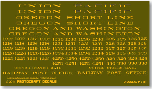 Previous Return to list of all Passenger & Head End Cars decals in 1:48 scale Next Lettering for 60' Postal cars - UP, OSL & O&W - post 1946 Lettering in Dulux yellow