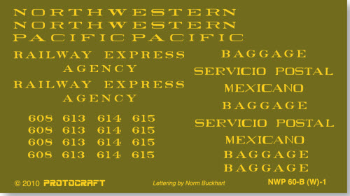 Northwestern Pacific’s wooden baggage cars were hand-me-downs from parent S.P. Not all road numbers are listed. This sheet is for NWP 613 - other numbers known for this car are 608, 614 and 615. #613 first started out with BAGGAGE lettered at each end of the car, later the right end sported a contract with REA. Additionally the lettering was shown centered from top to bottom and also seen with the lettering placed in the lower 1/3. Later, the car went to Mexico. With small modifications such as adding a lettering board over the tops of the baggage doors, this model is available as Ultrascale #613. Car body and trucks painted dark green, underbody black, wheels unpainted with a rust and dust coating:50% mixture of Floquil Grimey Black and 50% Floquil Zinc Chromate Primer. Decal sheet created and sized at Protocraft Decals with artwork by Norm Buckhart