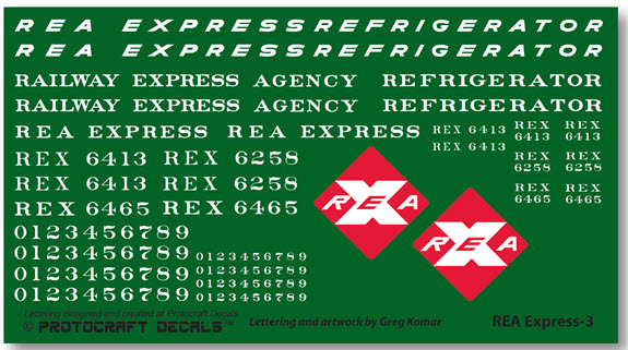 ![]() The Railway Express Agency was formed as part of the Governments nationalization of the railroads in 1918, as a national package delivery service by arranging transport and delivery via existing railroad infrastructure. It was created through a forced consolidation of four existing services - Wells Fargo & Co, Southern Express Company, Adams Express Co. and American Express Company - into a national near-monopoly to ensure the rapid and safe movement of parcels, money and goods during WWI. A fifth competitor entered the package delivery business: the US Post Office’s Parcel Post mail, riding in the baggage car in the US Post Office section. The consolidation of the REA took on a new corporate name: the American Railway Express Agency. This new entity took custody of all the pooled equipment and property of existing express companies. In March of 1929, the assets and operations of the American Railway Express, Inc., were transferred to Railway Express Agency. Reporting marks of REX with the corporate initials of REA. The REA was owned by 86 railroads in proportion to the express traffic on their lines; no one railroad or group of railroads controlled the agency. As a result of customer needs, the REA added a Chicago based refrigerator line, and in 1927, and air express division. Business during WWII was heavy, but rapidly declined at war’s end. In 1975, failing to take over the United Parcel Service; failing to enter the railcar piggyback and container service, and with the Civil Aeronautics Board cancelling their air express contracts with the airlines, the REA declared bankruptcy and ceased operations, and the once familiar green trucks with the red diamond shaped signs disappeared forever. The REA received 500 all-steel high-speed express refrigerator cars from American Car & Foundry during 1947 and 1948 as Series 6100-6599 under Lot 3175. These were the so-called “hundred-mile-an-hour” cars equipped with GCS BX high speed trucks. These were painted with dark green, aluminum and red bands on sides and ends. Another group of 50, 56’ wood-sheathed express refrigerator cars built by General American Transportation Corp in 1924, as Series 4000-4049, were later steel sheathed over the wood siding in 1936, and then later in 1952, were completely rebuilt into an all-steel car - see REX 4037 on the reverse side. A significant number of express refrigerator cars did not receive the REX reporting marks even though they operated as part of REA’s express car pool and had their own railroad name on the letterboard. Various lines in this category were ACL, ARE, AT&SF, CGW, CRDX, GN, NC&StL, PFE, PRR, SAL, SL-SF, and GARE. Paint & Lettering: Cars were painted in several different schemes during their lifetime of service. Prior to and immediately following WWII, the cars were painted Pullman green with gold leaf lettering. Later throughout most of the 1950’s cars were painted a darker REA Dark Green with DULUX Gold side and end lettering, including trucks and underbody. Roofs were normally black because they were covered with canvas and asphalt. In 1961, the REA painted their new steel cars with Apple Green sides, ends and roof, and revised it’s lettering scheme to include an italicized 60” red and white diamond monogram. Lettering, either straight or slanted, with all white stencil paste to match the white in the diamond monogram. A very comprehensive and excellent study of these cars can be found in Pat Wider and Ed Hawkins “ Railway Prototype Cyclopedia, (RP CYC) Vol 7, pages 1-77. See also Volume Eleven of ” F o c us on Freight Cars, pages 4 through 27, by Ted Culotta, Express and Head-End Cars. Decal set designed and created at Protocraft Decals with artwork by Greg Komar ![]() ![]() Background color shown above is not included in decal sheet |