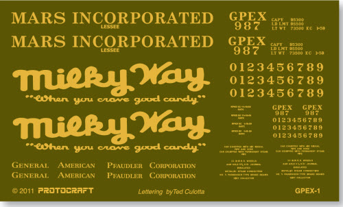 Painted all passenger dark green with Dulux yellow lettering, the Mars Company was one of the many lessees of these cars. The model was produced by Overland Models, Model #0700/O. Lettering and artwork by Ted Culotta. ![]() Background color shown above is not included in decal sheet |