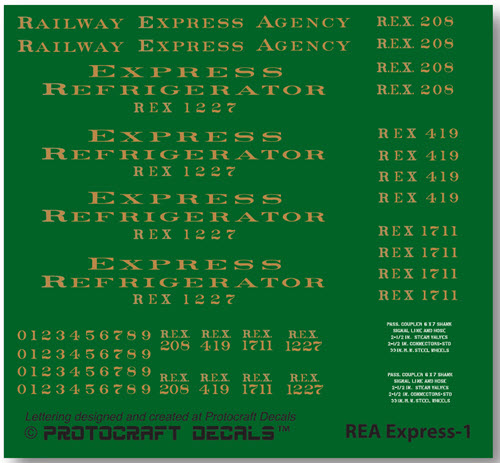 ![]() The Railway Express Agency was formed as part of the Governments nationalization of the railroads in 1918, as a national package delivery service by arranging transport and delivery via existing railroad infrastructure. It was created through a forced consolidation of four existing services - Wells Fargo & Co, Southern Express Company, Adams Express Co. and American Express Company - into a national near-monopoly to ensure the rapid and safe movement of parcels, money and goods during WWI. A fifth competitor entered the package delivery business: the US Post Office’s Parcel Post mail, riding in the baggage car in the US Post Office section. The consolidation of the REA took on a new corporate name: the American Railway Express Agency. This new entity took custody of all the pooled equipment and property of existing express companies. In March of 1929, the assets and operations of the American Railway Express, Inc., were transferred to Railway Express Agency. Reporting marks of REX with the corporate initials of REA. The REA was owned by 86 railroads in proportion to the express traffic on their lines; no one railroad or group of railroads controlled the agency. As a result of customer needs, the REA added a Chicago based refrigerator line, and in 1927, and air express division. Business during WWII was heavy, but rapidly declined at war’s end. In 1975, failing to take over the United Parcel Service; failing to enter the railcar piggyback and container service, and with the Civil Aeronautics Board cancelling their air express contracts with the airlines, the REA declared bankruptcy and ceased operations, and the once familiar green trucks with the red diamond shaped signs disappeared forever. There were literally thousands of these ubiquitous 53’ wood sheathed, steel underframed express refrigerator cars running in pretty much all of the Class I railroad high speed passenger trains throughout the US and Canada. Most were leased from builders such as General American Car Company and AC&F. The REA had 1,483 wood sheathed 53’-2” and 53’-6” refrigerator cars in service alone, plus hundreds of all-steel riveted cars. A significant number of express refrigerator cars did not receive the REX reporting marks even though they operated as part of REA’s express car pool and had their own railroad name on the letterboard. Various lines in this category were ACL, ARE, AT&SF, CGW, CRDX, GN, NC&StL, PFE, PRR, SAL, SL-SF, and GARE. Paint & Lettering: Cars were painted in several different schemes during their lifetime of service. Prior to and immediately following WWII, the cars were painted Pullman green with gold leaf lettering. Later throughout most of the 1950’s cars were painted a darker REA Dark Green with DULUX Gold side and end lettering, including trucks and underbody. Roofs were normally black because they were covered with canvas and asphalt. In 1953, the REA revised it’s lettering scheme to include the new 60” red and white diamond monogram. - (see Protocraft Decals REA Express-2) Most of the lettering remained DULUX gold, however some car’s lettering were lettered with white stencil paste to match the white in the diamond monogram. A very comprehensive and excellent study of these cars can be found in Pat Wider and Ed Hawkins “ Railway Prototype Cyclopedia, (RP CYC) Vol 7, pages 1-77. See also Vol u m e Eleven o f ”Focus on Freight Cars, pages 4 through 27, by Ted Culotta, Express and Head-End Cars. Decal set designed and created at Protocraft Decals ![]() ![]() Background color shown above is not included in decal sheet |