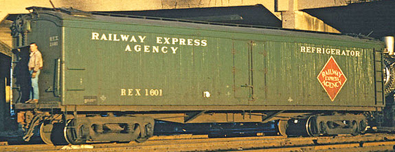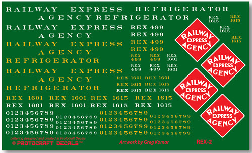 ![]() The Railway Express Agency was formed as part of the Governments nationalization of the railroads in 1918, as a national package delivery service by arranging transport and delivery via existing railroad infrastructure. It was created through a forced consolidation of four existing services - Wells Fargo & Co, Southern Express Company, Adams Express Co. and American Express Company - into a national near-monopoly to ensure the rapid and safe movement of parcels, money and goods during WWI. A fifth competitor entered the package delivery business: the US Post Office’s Parcel Post mail, riding in the baggage car in the US Post Office section. The consolidation of the REA took on a new corporate name: the American Railway Express Agency. This new entity took custody of all the pooled equipment and property of existing express companies. In March of 1929, the assets and operations of the American Railway Express, Inc., were transferred to Railway Express Agency. Reporting marks of REX with the corporate initials of REA. The REA was owned by 86 railroads in proportion to the express traffic on their lines; no one railroad or group of railroads controlled the agency. As a result of customer needs, the REA added a Chicago based refrigerator line, and in 1927, and air express division. Business during WWII was heavy, but rapidly declined at war’s end. In 1975, failing to take over the United Parcel Service; failing to enter the railcar piggyback and container service, and with the Civil Aeronautics Board cancelling their air express contracts with the airlines, the REA declared bankruptcy and ceased operations, and the once familiar green trucks with the red diamond shaped signs disappeared forever. There were literally thousands of these ubiquitous 53’ wood sheathed, steel underframed express refrigerator cars running in pretty much all of the Class I railroad high speed passenger trains throughout the US and Canada. Most were leased from builders such as General American Car Company and AC&F. The REA had 1,483 wood sheathed 53’-2” and 53’-6” refrigerator cars in service alone, plus hundreds of all-steel riveted cars. A significant number of express refrigerator cars did not receive the REX reporting marks even though they operated as part of REA’s express car pool and had their own railroad name on the letterboard. Various lines in this category were ACL, ARE, AT&SF, CGW, CRDX, GN, NC & StL, PFE, PRR, SAL, SL-SF, and GARE. Paint & Lettering: Cars were painted in several different schemes during their lifetime of service. Prior to and immediately following WWII, the cars were painted Pullman green with gold leaf lettering. Later throughout most of the 1950’s cars were painted a darker REA Dark Green with DULUX Gold side and end lettering, including trucks and underbody. Roofs were normally black because they were covered with canvas and asphalt. In 1953, the REA revised it’s lettering scheme to include the new 60” red and white diamond monogram. Most of the lettering remained DULUX gold, however some car’s lettering were lettered with white stencil paste to match the white in the diamond monogram. A very comprehensive and excellent study of these cars can be found in Pat Wider and Ed Hawkins “Railway Prototype Cyclopedia”, (RP CYC) Vol 7, pages 1-77. See also Volume Eleven of "Focus on Freight Cars", pages 4 through 27, by Ted Culotta, Express and Head-End Cars. Decal set designed and created at Protocraft Decals ![]() ![]() Background color shown above is not included in decal sheet |
