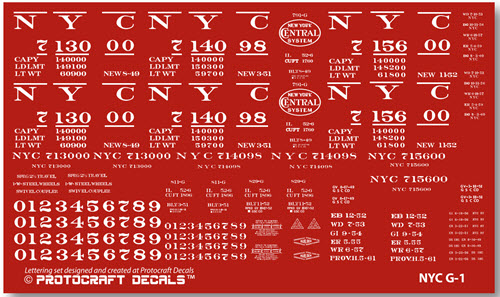 Paint & Lettering: Cars painted with DuPont 374-8004 Brown: TCP-221. Underframe and brake apparatus coated with F-1 black car cement. Lettering all white stencil paste. Between March 1944 and through August 1955, the NYC oval had a clear background. When the Gothic scheme was adopted in 1955, the NYC went back to having black backgounds in the oval. Note: Prior to February 20, 1941, all hoppers, flat cars and gondolas were painted black; from February 20, 1941 to June 6, 1956 they were painted DuPont Brown. After June 6, 1956, shops equipped for handling F-1 black car cement painted open cars black. Shops NOT equipped for handling F-1 cement painted open cars DuPont Brown (Speci.cation P-18) From 1960-1968, black paint replaced F-1 car cement and all shops painted open cars black. Some P&LE gondolas and flatcars were painted Century Green between 1960 and 1966.