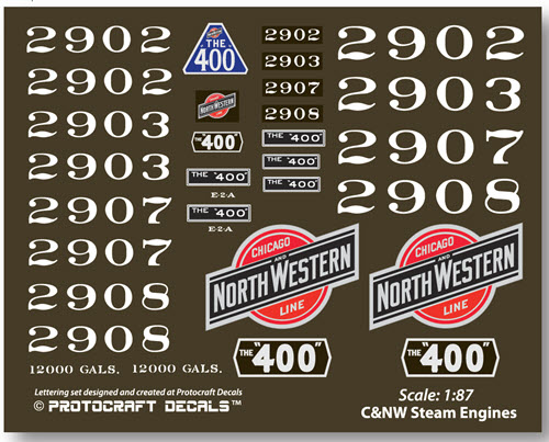 ![]() In January 1935, the Chicago & Northwestern, in order to meet the growing competition of the Milwaukee Railroad and the Burlington’s new service between Chicago and Minneapolis/St. Paul, reconditioned a number of cars into an air-conditioned train which it named the “The 400”. With speeds of up to 100 mph, pulled by one of 4 E2a Class Pacific’s (2902, 2903, 2907, 2908), these engines had new, large tenders with oil bunkers. Running on high-grade roadbed, the train made the 406.7 mile run in just 390 minutes including 4 stops. At the time it was the fastest train on the Continent - perhaps in the world. With automobiles able to speed up to 50 mph on recently improved highways, the train was an instant success arriving in half the time. Plans were immediately made to build a new light-weight streamliner to be in service by late 1938. Four A units, new EMC E-3’s, assigned road numbers of 5001A-B and 5002A-B, the two A’s coupled back to back, arrived in mid-1939 and operated for a short time with the heavy-weight train set until the new lightweight consists were delivered. The 20 streamlined cars, painted yellow and green, were finally put into service in September 24, 1939, completing the train. (see decal set C&NW 400 -2a for these cars) Decal set designed and created at Protocraft Decals ![]() ![]() |