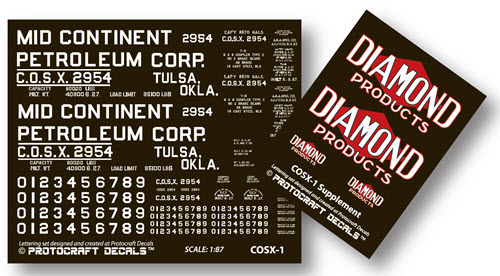 ![]() The Cosden Oil & Gas Company was started by Josh Cosden of Tulsa, Oklahoma in 1916. Cosden is credited with establishing Oklahoma as a major oil producing state, building a $35 million dollar oil business within the first 10 years. The Mid-Continent Oil Field in which all this was located was part of a broad area encompassing the central and southwestern United States, and until the discovery of oil in the Middle East, was the largest known oil reserve in the world. Cosden organized all his enterprises under one umbrella as the Mid-Continent Petroleum Corp. Acquired or merged with Sun Oils in 1955 to form D-X Sunray, Sunray D-X and Sunray Mid-Continent Oil Company. D-X was a brand of Mid-Continent’s “Diamond” and Sonoco gas stations. D-X was introduced in 1933, suggesting an “X” factor or unknown substance that made it’s gasoline superior to others. Stations sold motor oil, kerosene, Diamond gasoline, and an anti-knock compound “Nevr-Nox as a competitor to Ethyl. In 1935, Mid-Continent owned 2,232 tank cars. A total of 78 tank cars were built by AC&F for Cosden between 1919 and 1927, and Classed ARA III, Type 21. COSX 2954 was one of 8 cars of Lot 475, Series 2950-2957, built 6-27 . Paint & Lettering: Car painted all black; lettering in white lead stencil paste, and the red diamond herald. Decal set designed and created at Protocraft Decals ![]() |