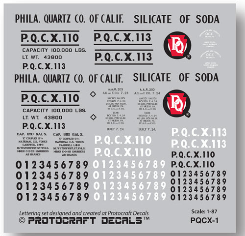 Paint & Lettering: Tank, including bottom sheet, painted aluminum, frame black. Lettering all black on aluminum and white on black. Note: there are photos of PQCX 108 and 110, painted with a black tank, an aluminum band and dome with aluminum lettering. See decal sheet PQCX-2