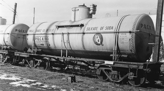 Philadelphia Quartz had two divisions, one in Philadelphia (PQX) and the other in Berkeley, California (PQCX). The Berkeley division had only a few cars: PQCX 108-110 built under AC&F Lot 1603 in January 1937, and PQCX 111-112, under Lot 2265 in May 1941. PQCX 113 below was purchased used and was built by Standard Tank Car in 1918. The tank was pressure tested on April 2, 1952