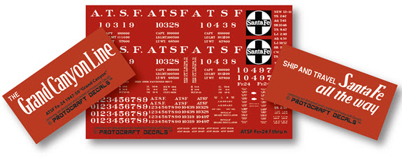 Previous Return to list of all decals in this line ATSF Next lettering for Santa Fe’s Fe-24 1947 “Grand Canyon” for gen. freight service: white lettering on mineral brown car