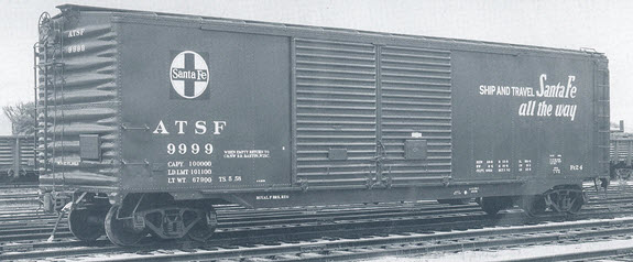 Built in December 1941 and early 1942, Pressed Steel delivered 500 fifty-foot cars to the Santa Fe under Lot number 5676. As-delivered road numbers as Series 10000-10499, and assigned into general freight service. Of this group 300 cars were selected for high-speed passenger express service and fitted with steam lines and Allied Full-Cushion high speed trucks, painted in coach green, renumbered into series 4100-4399, and lettered in DULUX yellow as express cars and dedicated to passenger service.