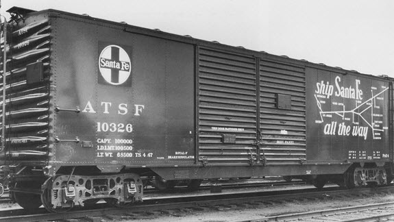 Note: For 50’ cars using the 1940 lettering scheme, the Santa Fe’s mechanical department designed stencils to be larger and longer (16‘) than those applied to the 40’ cars (12‘-6”). Beginning in 1947, when the Ship and Travel and later slogan scheme was applied, the new 1947 slogans were not resized, but used the 40’ boxcar size stencils on 50’ cars.