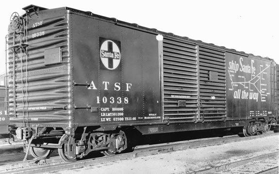 Note: For 50’ cars using the 1940 lettering scheme, the Santa Fe’s mechanical department designed stencils to be larger and longer (16‘) than those applied to the 40’ cars (12‘-6”). Beginning in 1947, when the Ship and Travel and later slogan scheme was applied, the new 1947 slogans were not resized, but used the 40’ boxcar size stencils on 50’ cars.