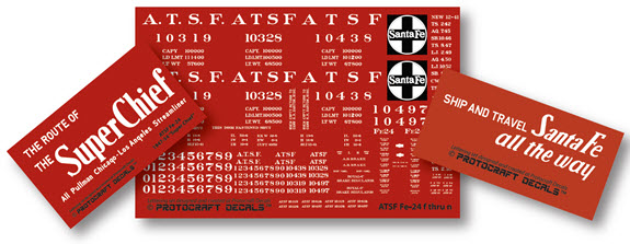 Previous Return to list of all decals in this line ATSF Next lettering for Santa Fe’s Fe-24 1947 “Super Chief” for gen. freight service: white lettering on mineral brown car