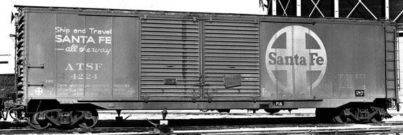 Built in December 1941, Pullman-Standard Car Company delivered 500 fifty-foot double-door cars to the Santa Fe under Lot number 5676. Initially given road numbers as Series 10000-10499. The rst 300 cars were selected for high-speed passenger express service and fitted with steam lines and Allied Full-Cushion high speed trucks, painted passenger green with DULUX synthetic gold stencilling and map/slogan scheme. In 1943 cars were renumbered into the 4100-4399 Series. The new 8 foot diameter cross scheme was introduced system-wide in 1959. The 8’ cross and the newly designed Ship and Travel were applied on both sides. Allied Cushion trucks were replaced with 50-ton ASF A-3 Ride-Control trucks. It was common to see these distinctive cars at the head-end position in almost all name trains across the country well into the 1950’s.