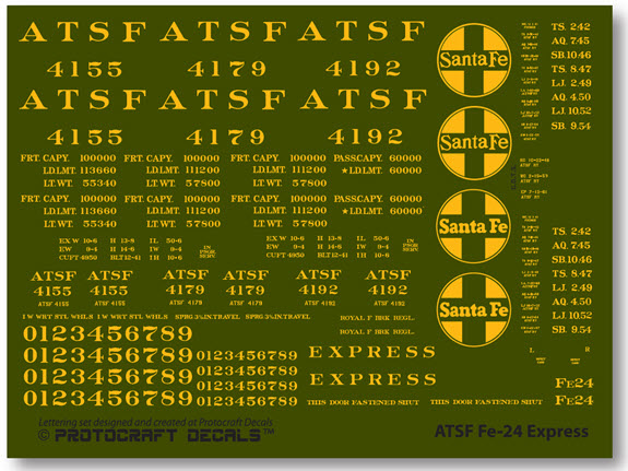 Previous Return to list of all decals in this line ATSF Next lettering for Santa Fe’s Fe-24 as delivered: gold on green: Express service