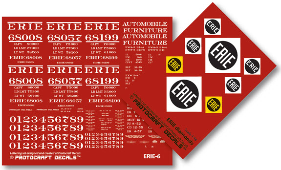 ![]() In October 1928, the ERIE received it’s first all-steel 50‘ autocars with an order of 100 cars from the Magor Car Corporation’s Clifton plant under Lot P6684. These were assigned road numbers as Series 68000-68099. In October of 1930, the ERIE received an addtional 100 autocars of the same plan from Pressed Steel Car Company’s McKees Rocks plant under PSC Lot 7, and assigned road numbers as Series 68100-68199. Inside height of both series was 10’-0”. AAR Class designation was XAF. Cars were equipped with Ajax vertical staff hand brake and wood running boards. End doors were built by Standard Railroad Equipment Corp of Chicago, as were the 3/3/3 Dreadnaught Square corner ends. Roof was a Chicago-Cleveland Climax Radial design. Paint & Lettering: Car sides painted freight car brown: TCP #215. Ends, roof, doors, door tracks, truck sideframes and underframe coated with black car cement. As-delivered, cars received the black and white 34” monogram positioned at 2” below the roof line. On January 14, 1944, the ERIE introduced the yellow and black 34” monogram, positioned 8” lower (10“ total), with Automobile and Furniture lowered 8” also. In mid-1946, this was painted over with the new 6’ tall black and white monogram positioned 6” below the roof line. “Automobile” and “Furniture” were no longer used, and data was spread horizontally. See over for this example. Decal set designed and created at Protocraft Decals ![]() ![]() Background color shown above is not included in decal sheet |