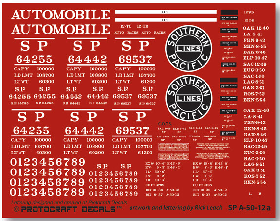 ![]() The SP received it’s first group of 50‘ double-door, all-steel autocars from General Amercian Transportation Corporation as Class A-50-12, as follows: Series 69530-70029, 500 cars, General American Transportation Corporation, delivered October-December 1936 Beginning with cars 69555 through 70029, Evans Type F loaders for automobiles were installed, the second batch of cars in 1937, Series 64100-64525, came equipped with truck loaders and the remaining cars in the Series 64526-64924, had no loaders installed and was used for bulky cargo such as farm machinery, long lumber and furniture. Cars came with 4/5 Dreadnaught square-corner ends, Equipco Power hand brakes and wood running boards. Paint & Lettering: Cars painted with SP’s Freight Car brown: TCP-211. Lettering all white stencil paste. 3” white stripe on right door indicates vehicle loading devices are installed. Decal set designed and created at Protocraft Decals ![]() ![]() Background color shown above is not included in decal sheet |