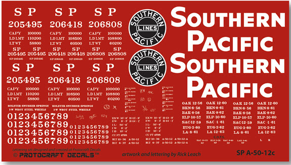 ![]() The SP received it’s first group of 50‘ double-door, all-steel autocars from General American Transportation Corporation as Class A-50-12, as follows: Series 69530-70029, 500 cars, General American Transportation Corporation, delivered October-December 1936 By 1956, these cars had been transferred into auto parts service, and were renumbered and reclassified as XMR - renumbering is as follows: Series 69530-70029 to 206311-206808 Paint & Lettering: Cars painted with SP’s Freight Car red: TCP-211. Lettering all white stencil paste. The large 24” tall S and P with the 16“ lettering replaced the standard road name, and placed on the right side of the doors. The 45” medallion now over the reporting marks on the left side of the doors. The medallion was discontinued by 1960. Note: cars depicted on this page are of a later class but lettering placement is correct for A-50-12’s. Decal set designed and created at Protocraft Decals ![]() ![]() Background color shown above is not included in decal sheet |