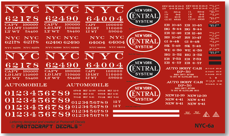 ![]() Beginning in December, 1939, the NYC’s Despatch Shops (Despatch Transportation Corp) built 1,100, 50’ double-door automobile/furniture cars for the NYC. With the maximum approved AAR height of 10’-6”, the cars had 5/5 Dreadnaught ends with the new stronger round (W) corner construction, Universal Power hand brakes and wood running boards. Unique to a small group of cars produced at this time were the additonal edge under the Murphy raised panel roof, creating double-lapped edges as a further step to prevent moisture seepage. Series 62000-62299, 300 cars, Despatch Shops order #764. NYC Lot 678-B - delivered December 1939 (renumbered to 74000-74299 in 1958) Paint & Lettering: Cars painted with NYC red-brown: TCP-221. Underbody and truck side frames coated with black car cement. Wheels and axles left unpainted and allowed to rust and gather road grime. Lettering all white stencil paste. Note: Up until mid-1944 to 1945, cars were stenciled without the black background in the 48-3/8” x 32-1/2” NYC oval. At the end of this period and up until the modernized scheme was adopted in 1955, NYC went back to having a black background in the oval. Decal set designed and created at Protocraft Decals ![]() ![]() Background color shown above is not included in decal sheet |