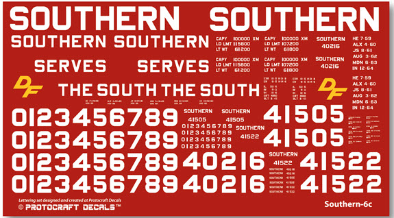 ![]() Beginning in August of 1941, the Southern Railway received 400, 50’ double-door automobile/furniture cars built by Mt. Vernon Car Manufacturing Company. Only the first 100 were equipped with end doors. Series 40200-40249, 50 cars, Mt. Vernon Car Manufacturing Company, Job 9740 - delivered August 1941 - End Doors Paint & Lettering: Car body painted Southern Spec. #84, a medium brown shade. Lettering all white lead stencil paste. Trucks coated with two coats of steel car black. Wheels not to be painted. Note: This decal set is for the 1959 24” tall block letter reporting marks and 2“ data stencils. The 60” diameter monogram has been discontinued and the 24”reporting marks and 2“ data are to the right side of the doors. To the left of the doors the new slogan “SOUTHERN SERVES THE SOUTH” was added. Capacity data remained in place to the left of the doors. End lettering for all schemes was 4” and on the B end was on the top of the rib and centered on the end. No longer in automobile service by 1964, many had their end doors sealed shut. Decal set designed and created at Protocraft Decals ![]() ![]() Background color shown above is not included in decal sheet |