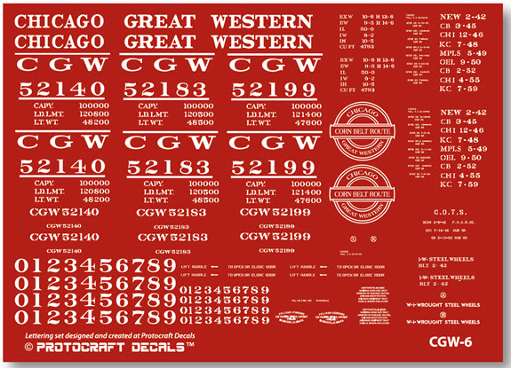 ![]() In February 1942, the Chicago Great Western took delivery of 200, 50’ automobile cars from Pullman-Standard Car Manufacturing Co., Michigan City plant, under Lot 5708, as assigned road numbers as Series 52000-52199. The cars had two unique features - Pullman Patented Corrugated 5/5 ends with square corner construction, and more obvious, the 7-panel Superior double-doors were centered on the car side rather than the traditional left positioning on autocars; one of the intended use for the cars was newsprint service. Centered double-doors were easier for forklift loading of large rolls. The list of specialties include Equipco Power hand brake and a Murphy raised panel roof with wood running boards. Paint & Lettering: Cars painted freight car brown: close to TCP-190; ends and underframe coated with black car cement; trucks painted black. Running board left unpainted. Lettering all white stencil paste. Decal set designed and created at Protocraft Decals ![]() ![]() Background color shown above is not included in decal sheet |