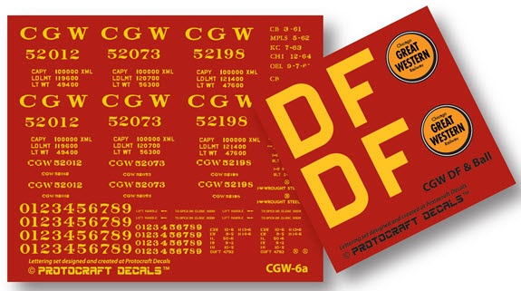 ![]() In February 1942, the Chicago Great Western took delivery of 200, 50’ automobile cars from Pullman-Standard Car Manufacturing Co., Michigan City plant, under Lot 5708, as assigned road numbers as Series 52000-52199. The cars had two unique features - Pullman Patented Corrugated 5/5 ends with square corner construction, and more obvious, the 7-panel Superior double-doors were centered on the car side rather than the more common staggered positioning on autocars. The list of specialties include Equipco Power hand brake and a Murphy raised panel roof with wood running boards. Paint & Lettering: Cars painted freight car red: close to TCP-190; underframe coated with black car cement; trucks painted black. Running board left unpainted. By 1951, repainted cars were lettered with black outlined Roman style white letters and the “Corn Belt Route” herald was dropped. Later beginning in 1961, yellow lettering and the orange ball were employed. The large block style DF indicated that Damage Free Evans movable Special Devices or Evans Products Company compartmentizers for securing cargo was installed, greatly reducing cargo damage during travel. Decal set designed and created at Protocraft Decals ![]() Background color shown above is not included in decal sheet |