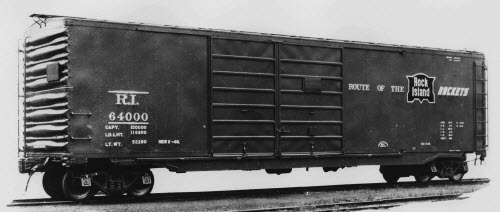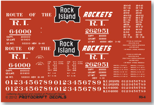 ![]() In January 1941, the R.I. received 200, 50’ , 10’-6” IH auto boxcars from AC&F, Lot 2116 and assigned series 262800-262999. In November, 1946, the R.I. received an addtional 250, 50’, 10‘-6” IH steel auto boxcars from AC&F, Lot 2928, and assigned series 64000-64249. ![]() ![]() Background color shown above is not included in decal sheet |
