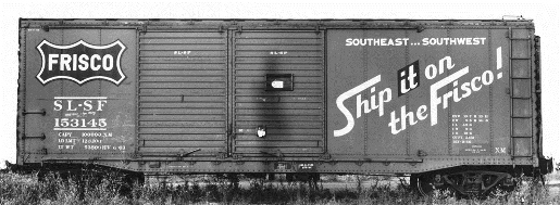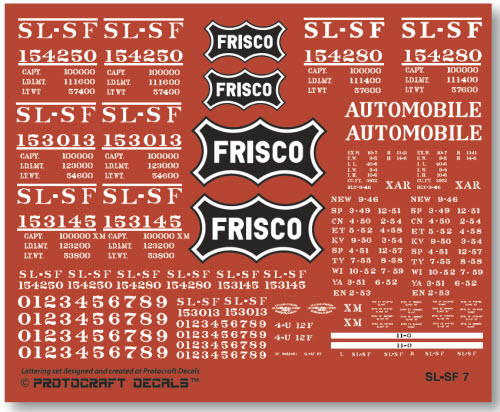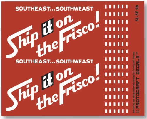 In September 1946, the SL-SF received 300, 40’ autocars from Pullman-Standard Car, Lot 5835, Series 154000-154299, with 14’ door openings and a 10’-6” IH and 4/4 Improved Dreadnaught ends. These were later renumbered to Series 153000-153299 and given the “Ship it on the Frisco” slogan. ![]() ![]() ![]() Background color shown above is not included in decal sheet |