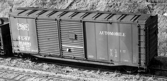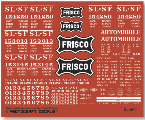 In September 1946, the SL-SF received 300, 40’ autocars from Pullman-Standard Car, Lot 5835, Series 154000-154299, with 14’ door openings and a 10’-6” IH and 4/4 Improved Dreadnaught ends. These were later renumbered to Series 153000-153299 and given the “Ship it on the Frisco” slogan (see Protocraft Decals sheet SL-SF-7b). Model: PC-3314 ![]() ![]() Background color shown above is not included in decal sheet |