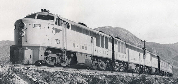 In December of 1945, the UP took delivery of it’s rst passenger diesels. These units were powered by opposed piston diesel engines - a new design for the Navy’s submarine diesel engines, prohibited for nonmilitary use by the War Production Board until 1945. Built at General Electric’s Locomotive and Car Equipment Division plant at Erie, Pennsylvania, they became known as “ERIE Builts”. This rst set of A-B-A units were assigned road numbers as Series 50-M-1a, 50-M-2a and 50-M-3b. The UP’s publicity photo above shows the set running backwards with 50-M-2a in the lead and 50-M-1a in the rear. In August 1946, these units were renumbered to 981A, 982A and 983B, and later in March 1948 to 700, 701 and 700B; and nally in February 1953, to 650, 651 and 650B. These rst 3 units came with rectangular front cab windows - a distinctive look as well as unusual F-M straight-equalized fabricated power trucks. Subsequent units came with a large curved windows and cast side frame A!A Alco-Baldwin F-M trucks.