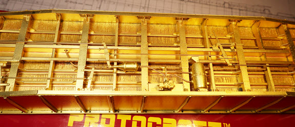 ![]() In November 1957, the Rock Island built their first group of 450 cars of the ‘cloned Greenville Gon”, a design that evolved from the original 1940 A.M.C. design, in their own shops using ‘kit’s supplied by Pullman-Standard, who at the same time was building these cars for the FRISCO under P-S Lot 5943. (see PC-3610 for a model of FRISCO’s car). These received road numbers as Series 1300-1749, and had a 1-3/8” hardwood floor. The shop continued building an additional 50 cars at the same time, as Series 1750-1799, but with Nailable Steel floors. Eight years later, the RI ordered 100 more cars of the same design directly from Pullman-Standard under Lot 8356B, again with the 1-3/8” hardwood floor, and assigned Series 2400-2499. All three groups of cars, 600 in all, received the Pullman Patented ends which had a newer, larger and straighter rib pattern, and was very distinctive. Protocraft received copies of drawings for the Pullman car from the Pullman Library, which Boo Rim used to build these cars to a very exact model. The early series, 1300-1749, used the same components and we believe that this is the correct model for this series also. Consequently decals and lettering for both series would be correct. Besides the Pullman Patented drop ends, the cars used the Equipco Lever hand brake and the more modern Morton brake step, Wine door locks, Wine Lading tie down roping rods welded to the top of the side, and 16 interior folding stake pockets (vs the usual 28), plus the normal 1-1/4” chamfered rope/cable holes in the top chord. Cars were painted with the Rock Island’s freight car maroon with 18” block lettering in white stencil paste. Decals for this car are available from Protocraft Decals ![]() ![]() ![]() |