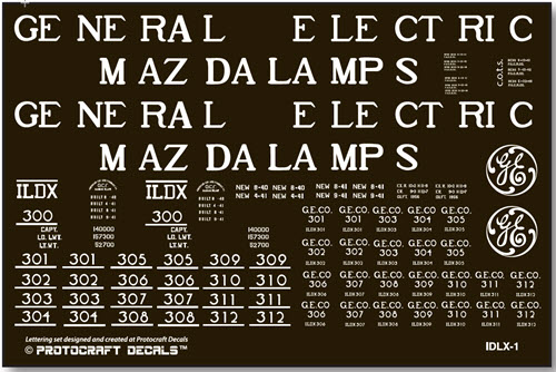 AC&F built a number of 34’ covered hoppers for General Electric, beginning with #300, as a one-car order under Lot 2082, delivered August, 1940. Cars were used to carry silica sand for the production of GE’s Mazda lamps, and later GE lamps. In April, 1941, 4 more were delivered under Lot 2148, Series 301-304, and again in August, 1941, Lot 2251, two more cars as Series 305-306. In September 1941 under Lot 2335, one car as Series 307; still again in the same month, 2 more cars under Lot 2383, Series 308 and 309. In April of 1942, 3 more cars were delivered under Lot 2468, Series 310-312. (note: for other Lot and Series of GE covered hoppers, see all four dierent Protocraft Decal sheets for these schemes)