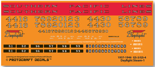 ![]() In late 1936, under the guidance of SP’s president Angus McDonald, the SP developed a new modern, lightweight streamliner with a new logo and a black, red and orange paint scheme designed by Charles Eggelston, that extended the entire length of the train, setting off what became known as the most beautiful train in the world. Sticking to what it knew well, the SP and Lima Locomotive Works developed a superpower 4,500 HP steam locomotive capable of sustained speeds of 90 mph, which together with it’s booster engine, developed 62,500 lbs of tractive force, capable of mastering the 2.2% Cuesta grade between San Francisco and Los Angeles with 12 cars unassisted. Decal set designed and created at Protocraft Decals GS-3 locomotives numbered 4416-4429 Daylight Trains: Morning Daylight: Train No. 98 & 99* San Joaquin Daylight: Train No. 51 and 52 The Starlight: Train No. 94 and 95** The Lark: Train No. 74 and 75 * later known at the Coast Daylight ** replaced the daytime Noon Daylight as an all night train ![]() ![]() |