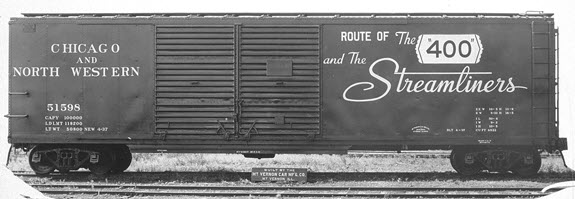 ![]() In May 1937, the C&NW received 500, 50’ double-door automobile cars from Mt. Vernon Car Company under Lot 9227. These were assigned road numbers as Series 51000-51998, even numbers only. Construction was with a Viking roof, 4/5 Dreadnaught ends with the square corner design and 4/6 riveted side panels for a 10’-6” inside height. Side panels featured two additional rivets centered on each panel. Cars were equipped with Equipco Power hand brake and wood running boards. Automobile loading chain tie-down storage pipes extending below floors. Car ran on Bettendorf design 50-ton trucks.